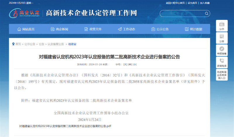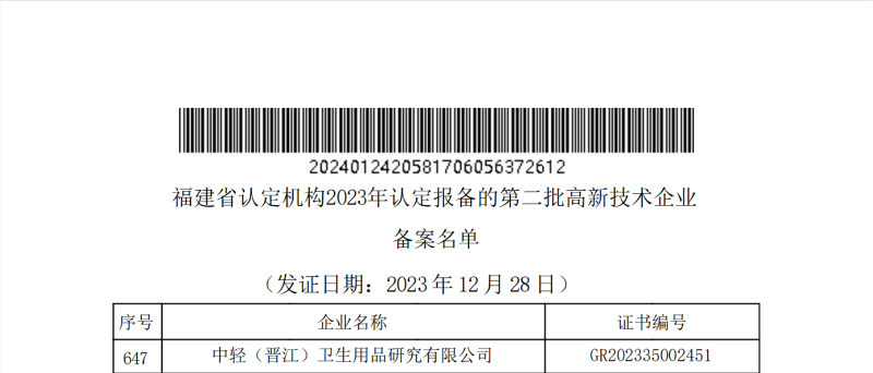 1月24日,高新技術(shù)企業(yè)認定管理工作網(wǎng)發(fā)布公告,中國造紙院所屬中輕(晉江)衛(wèi)生用品研究有限公司(以下簡稱“中輕衛(wèi)品”)獲批國家高新技術(shù)企業(yè),標志著中輕衛(wèi)品公司在科技創(chuàng)新能力、技術(shù)服務(wù)水平、自主知識產(chǎn)權(quán)儲備、人才隊伍建設(shè)等方面邁上新臺階。